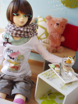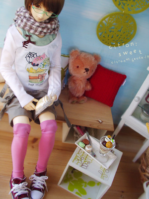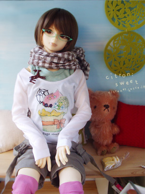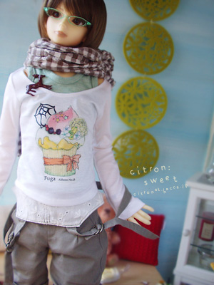 サロペット、カラーソックス、ストール、ブローチ、ミニチュアフード: citron